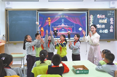 1月16日,鴉崗小學(xué)的同學(xué)們?cè)谡n堂上了解、體驗(yàn)三鄉(xiāng)木偶戲。記者 繆曉劍 攝