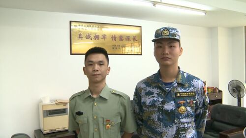 身穿綠色軍裝的叫余英維,旁邊穿迷彩服的是鄧爾康。中學(xué)的時(shí)候,他們就一起上學(xué),2017年,高中一畢業(yè)就攜手一起報(bào)名圓了心里的軍旅夢(mèng)。