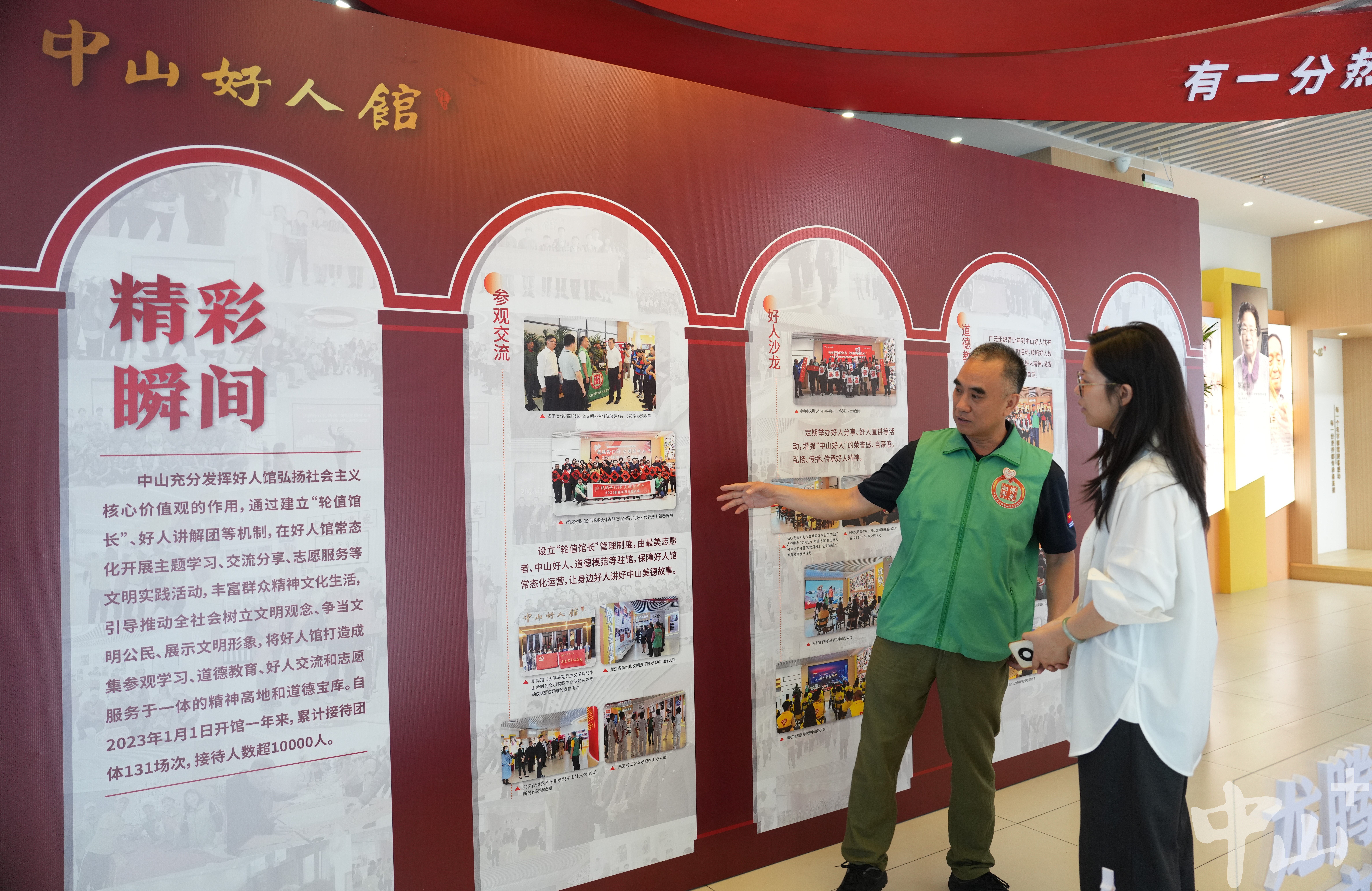 作為一名退伍軍人,李克有很多曾一起在戰(zhàn)場(chǎng)上出生入死的戰(zhàn)友,其中不乏已經(jīng)為國(guó)捐軀的烈士。自2007年起,他便自發(fā)組織尋找犧牲的中山籍戰(zhàn)友,先后6次帶隊(duì)前往廣西邊境的多個(gè)烈士陵園,成功尋到29名犧牲戰(zhàn)友信息,并將相關(guān)信息報(bào)送給中山市退役軍人事務(wù)局。 “我有一位戰(zhàn)友,寧愿把生的希望留給其他人,19歲不到就犧牲在戰(zhàn)場(chǎng)上。他們已經(jīng)離我們而去,更重要的是我們能為他們做些什么。所以逢年過(guò)節(jié)我都會(huì)看望他們的家人,把歡樂(lè)也帶給老人家?!崩羁苏f(shuō)。 2016年,得知戰(zhàn)友的女兒患先天性心臟病,須進(jìn)行心肺聯(lián)合移植手術(shù),李克立即帶頭捐款,并聯(lián)系政府相關(guān)部門和電視臺(tái),通過(guò)媒體報(bào)道讓更多愛(ài)心人士關(guān)注到了這位困難老兵。在他的多方奔走下,社會(huì)各界紛紛伸出援助之手,募集醫(yī)藥費(fèi)40余萬(wàn)元,助戰(zhàn)友的女兒順利完成了手術(shù)。 牽頭成立志愿服務(wù)隊(duì) 延續(xù)志愿精神 作為一名有著30多年志愿服務(wù)經(jīng)歷的資深志愿者,李克的生活已經(jīng)與志愿分不開(kāi)。他的身上始終有一抹綠色:在軍營(yíng),是守衛(wèi)國(guó)門的綠軍裝;在社區(qū),是服務(wù)群眾的綠馬甲。在人民群眾需要的地方,李克每次都沖在最前線。 “2020年疫情暴發(fā)時(shí),很多人都響應(yīng)號(hào)召待在家里,我覺(jué)得作為一個(gè)打過(guò)仗的老兵,我總得站出來(lái)做點(diǎn)事?!睕](méi)有過(guò)多考慮,李克第一時(shí)間加入到了志愿者隊(duì)伍中,并在社區(qū)堅(jiān)守了整整60天。當(dāng)時(shí)防護(hù)物資匱乏,李克還自掏腰包托人在廣州購(gòu)買了6萬(wàn)元左右的防護(hù)物資,全部捐贈(zèng)給了在一線抗疫的工作人員。 近年來(lái),李克還積極捐資助學(xué)、支援災(zāi)區(qū)、扶危濟(jì)困,連續(xù)6年資助6名困難學(xué)生,為汕尾市陸河中學(xué)捐贈(zèng)10套多媒體電腦設(shè)備,堅(jiān)持參與無(wú)償獻(xiàn)血直到60歲。 2018年起,李克擔(dān)任文明城市巡查監(jiān)督員,奔走在街道各個(gè)路口、每條小巷,整理亂停亂放的共享單車,清理“牛皮癬”小廣告,保障街頭巷尾干凈衛(wèi)生。同一年,為更有組織地開(kāi)展志愿活動(dòng),李克牽頭成立了一支以退役軍人為主導(dǎo)的東區(qū)博愛(ài)擁軍志愿服務(wù)隊(duì),把戰(zhàn)友們凝聚在一起,共同為社會(huì)作貢獻(xiàn)。如今,這支志愿服務(wù)隊(duì)已從最初的8名成員,逐漸壯大至400多人,成為服務(wù)社會(huì)的一支生力軍。 講好好人故事,傳承紅色文化 4月19日上午,記者在“中山好人館”見(jiàn)到了正在擔(dān)任“輪值館長(zhǎng)”的李克。從去年1月開(kāi)始,他每個(gè)月都參與輪值,先后為140多場(chǎng)活動(dòng)、1萬(wàn)多名市民群眾義務(wù)講解博愛(ài)之城的凡人善舉、好人大愛(ài)。  正在中山好人館輪值的李克。記者 劉萬(wàn)杰 攝