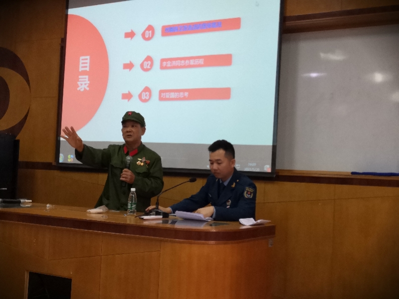 李金洪與陳偉樂兩代退役軍人同臺講述崢嶸歲月。 由于身體不適,李金洪無法長時(shí)間親述那段崢嶸歲月,但是這位老兵又是那么熱心地想讓更多后輩知道祖國的不容易,人民當(dāng)今幸福生活的來之不易,毅然接受邀請,克服身體不適,再次走上講臺,結(jié)合親身經(jīng)歷給在場師生講述1979年那段崢嶸歲月。李金洪表示,軍人的使命是保衛(wèi)祖國,抵抗侵略,“如果再給我選擇的機(jī)會(huì),我還是義無反顧上戰(zhàn)場,我們有偉大的共產(chǎn)黨、有偉大的制度、有偉大的祖國和人民,我們應(yīng)該為自己是一名中國人和生活在祖國的大地上感到驕傲和自豪”。 此次宣講活動(dòng)中,李金洪多了一個(gè)戰(zhàn)友,他叫陳偉樂,是駐香港部隊(duì)的退役軍人,也是神灣鎮(zhèn)退役軍人服務(wù)中心的工作人員,李金洪和陳偉樂雖然是不同時(shí)代的退役軍人,但是有著同一個(gè)方向,就是對黨、祖國和人民無限的愛。李金洪身體不適,陳偉樂就來充當(dāng)他的“傳聲筒”,將一段段難忘經(jīng)歷分享給廣大師生們。