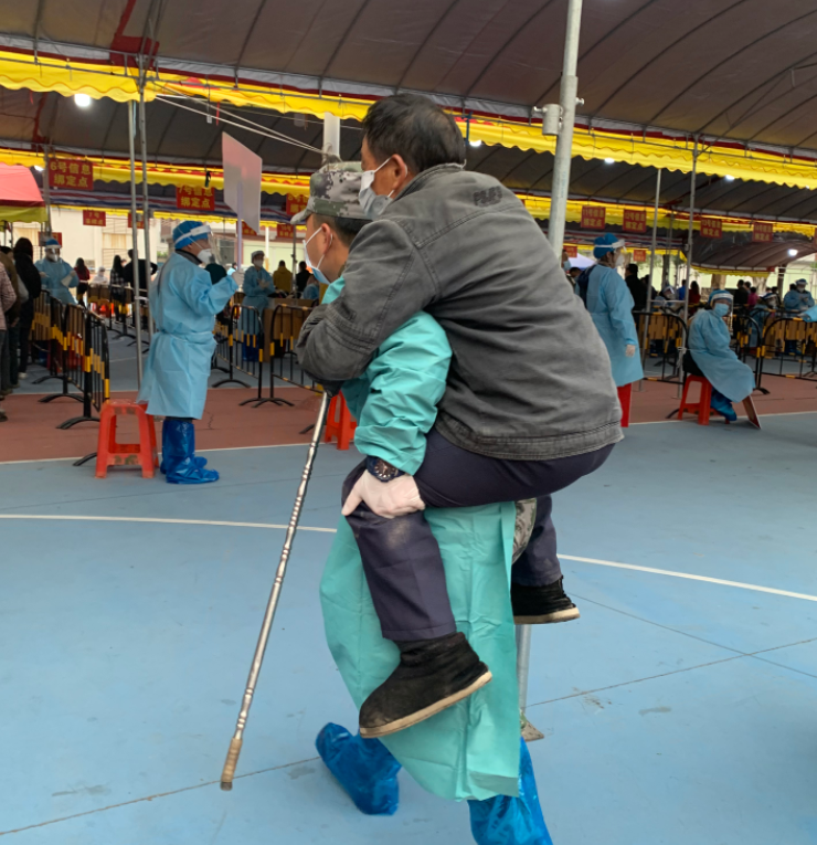 在小欖鎮(zhèn)聯(lián)豐社區(qū)核酸檢測采樣現(xiàn)場,退役軍人吳鴻文背起一位行動不便的老人前往核酸采樣工作臺,采樣結(jié)束后,將老人送出場外。臨走的時候老人連聲向他道謝。 此外,民眾街道退役軍人服務(wù)中心動員紅旗志愿服務(wù)隊(duì)退役軍人志愿者分別前往該街道18個免費(fèi)便民核酸采樣點(diǎn),助力街道開展核酸檢測工作。 |