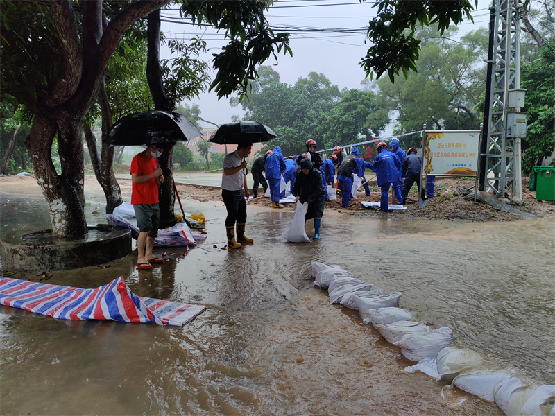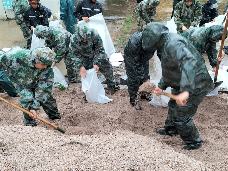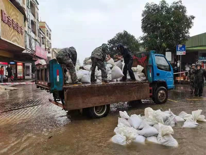 ▲圖為神灣鎮(zhèn)民兵在裝沙袋,準備堵住內(nèi)澇道路。(通訊員 吳容照 攝)