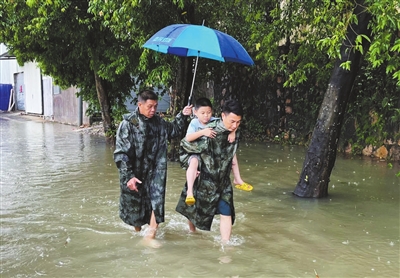 退役軍人梁卓興和泉眼村消防站隊(duì)員一起涉水將小朋友安全送回家中。通訊員供圖