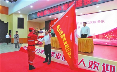 中山市人民政府副市長(zhǎng)曾奕給中山市擁軍支前紅旗服務(wù)隊(duì)授旗。      楊啟寧 攝