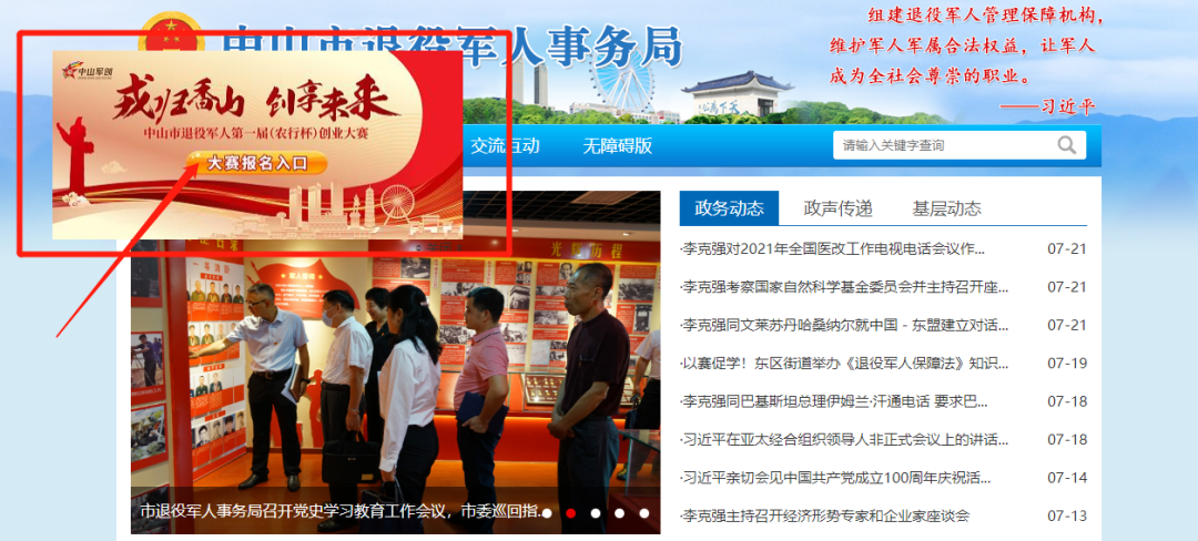 由中山市退役軍人事務(wù)局、中山市人力資源和社會保障局共同舉辦,主題為“戎歸香山 創(chuàng)享未來”的中山市退役軍人第一屆(農(nóng)行杯)創(chuàng)業(yè)大賽正在火熱報(bào)名中。為幫助廣大退役軍人更高效、準(zhǔn)確地報(bào)名參加大賽,制作了以下指引,希望對廣大參賽者有所幫助。 中山市退役軍人第一屆(農(nóng)行杯)創(chuàng)業(yè)大賽報(bào)名方式有以下三種: 一、官方網(wǎng)站報(bào)名 二、微信公眾號報(bào)名 三、郵箱報(bào)名 官方網(wǎng)站報(bào)名 01 登錄大賽官方網(wǎng)站 在瀏覽器輸入網(wǎng)址:http://tyjr.zs.gov.cn/,點(diǎn)擊飄窗【大賽報(bào)名入口】進(jìn)入用戶登錄界面。如圖1所示: