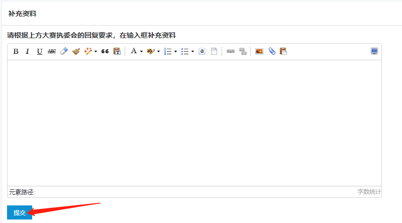 圖14 08 補(bǔ)充資料提交 若想對已提交的報(bào)名信息進(jìn)行補(bǔ)充,可在登陸首頁點(diǎn)擊“我的報(bào)名記錄”,點(diǎn)擊【查看詳情】進(jìn)入報(bào)名表詳情頁面,拉至頁面底部的補(bǔ)充資料欄,點(diǎn)擊回形針圖標(biāo)添加補(bǔ)充文件,再點(diǎn)擊提交即可。如圖15-16所示: