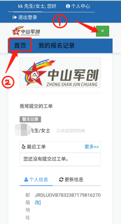圖23 登錄成功后可跳轉(zhuǎn)至“個(gè)人中心”,點(diǎn)擊右上角綠色圖標(biāo)可展開菜單欄,點(diǎn)擊【首頁】即可進(jìn)入“參賽承諾書”確認(rèn)界面開始填寫報(bào)名列表。如圖24所示: 報(bào)名列表填寫詳細(xì)操作可參考報(bào)名方式一“官方網(wǎng)站報(bào)名”步驟4-8指引。