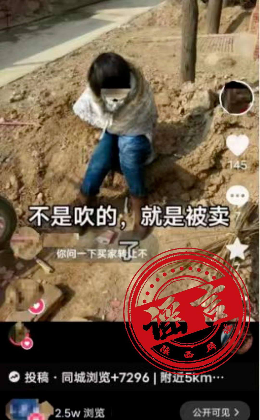 2024年1月10日,網民張某某(女,39歲,蒲城龍陽人)為博取關注、吸引流量,利用了一張自己14年前拍攝坐在土堆前的照片,并配有“不是吹的,就是被賣了”的字眼制作成視頻后,發(fā)布在抖音平臺上,同時與網民互動交流,先后有超過2.5萬人次瀏覽。