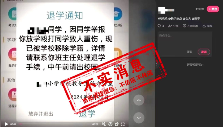 無獨有偶,近期重慶酉陽縣某小學一學生也對這則謠言進行“模仿秀”,在網(wǎng)上惡搞“克隆”出“退學通知”,并以學校名義署名落款。相關(guān)謠言在網(wǎng)上傳播后引發(fā)議論。目前,這則謠言已被刪除,學校對該學生進行了批評教育。