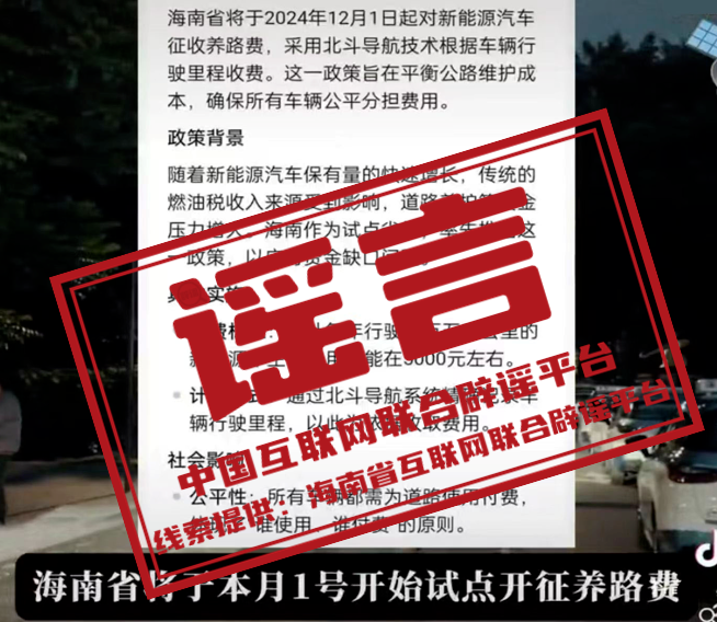 謠 言 海南12月1日起對(duì)新能源汽車(chē)征收養(yǎng)路費(fèi)?