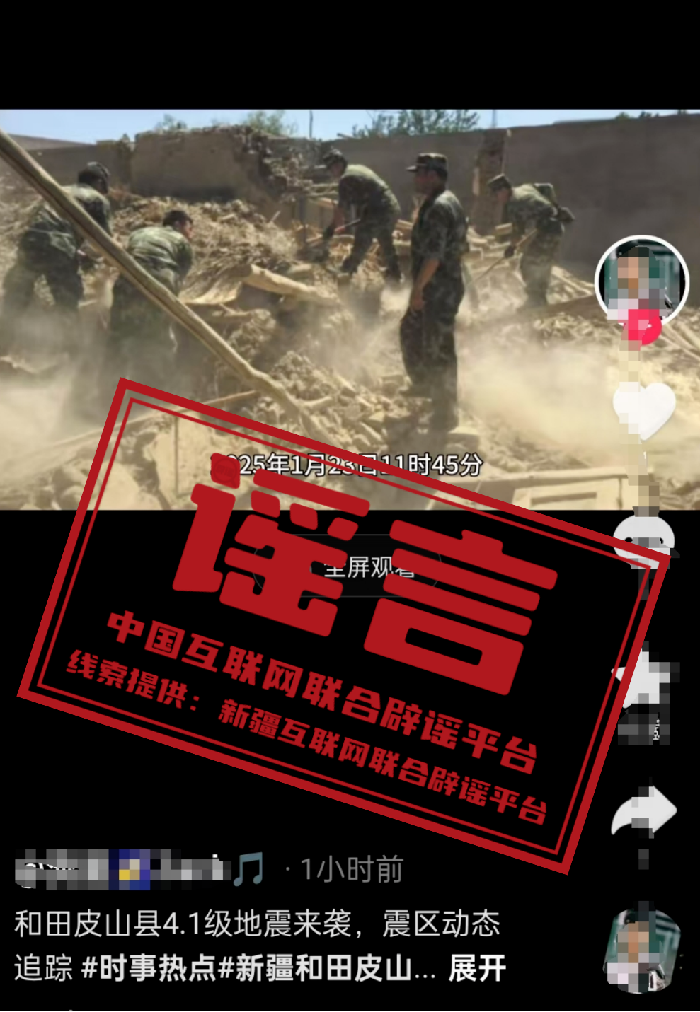 真相:中國地震臺網(wǎng)正式測定,2025年01月23日11時(shí)45分在新疆皮山縣(緯度36.94°,經(jīng)度78.87°)發(fā)生4.1級地震,震源深度15公里,震中附近地形類型為山地,5公里范圍內(nèi)平均海拔高度為2484米,距離皮山縣92公里。個(gè)別網(wǎng)民關(guān)聯(lián)此次地震,發(fā)布“房屋倒塌、道路坍塌及應(yīng)急救援”等謠言圖片和短視頻,博取流量誤導(dǎo)網(wǎng)民。經(jīng)皮山縣應(yīng)急管理局核實(shí),此次地震未造成人員傷亡及財(cái)產(chǎn)損失。對編造散布地震謠言擾亂公共秩序、造成惡劣社會影響的行為,公安機(jī)關(guān)將依法依規(guī)嚴(yán)肅查處。請廣大網(wǎng)民擦亮眼睛,勿輕信傳播非正規(guī)來源、未經(jīng)證實(shí)的地震信息。(來源:新疆網(wǎng)絡(luò)辟謠)