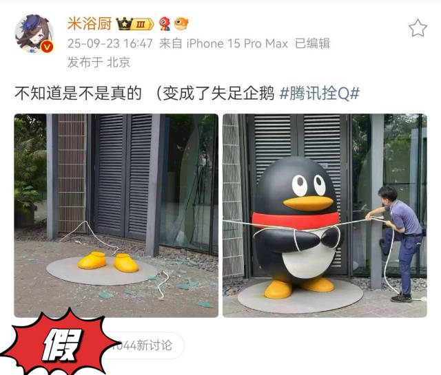 比如騰訊公司門(mén)口的企鵝雕塑,公司為了防御臺(tái)風(fēng),將企鵝用繩拴了起來(lái)。而有網(wǎng)民傳播的圖片顯示企鵝只剩雙腳,上身被風(fēng)吹走。騰訊QQ回應(yīng):“鵝拴著呢,穩(wěn)穩(wěn)的。”