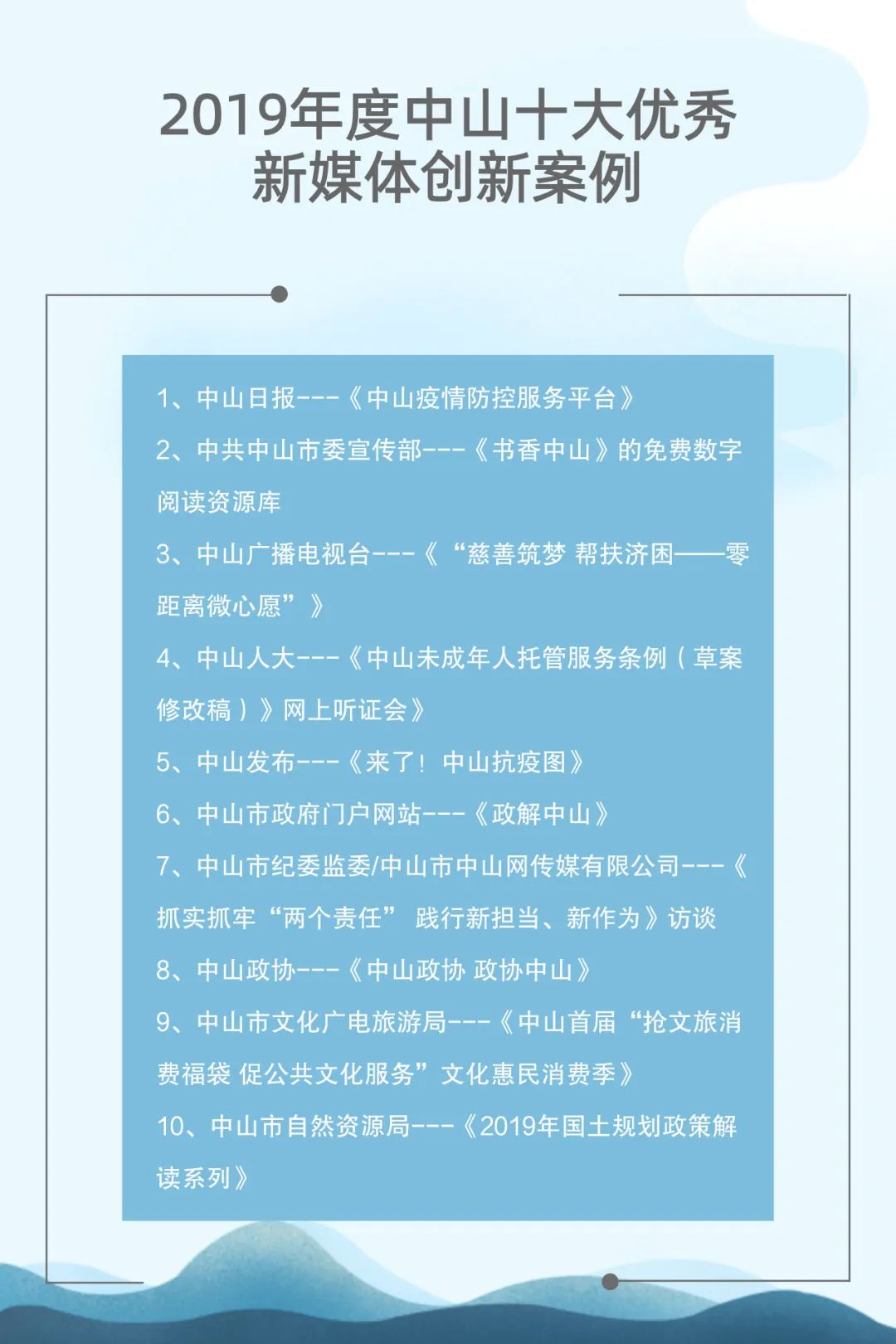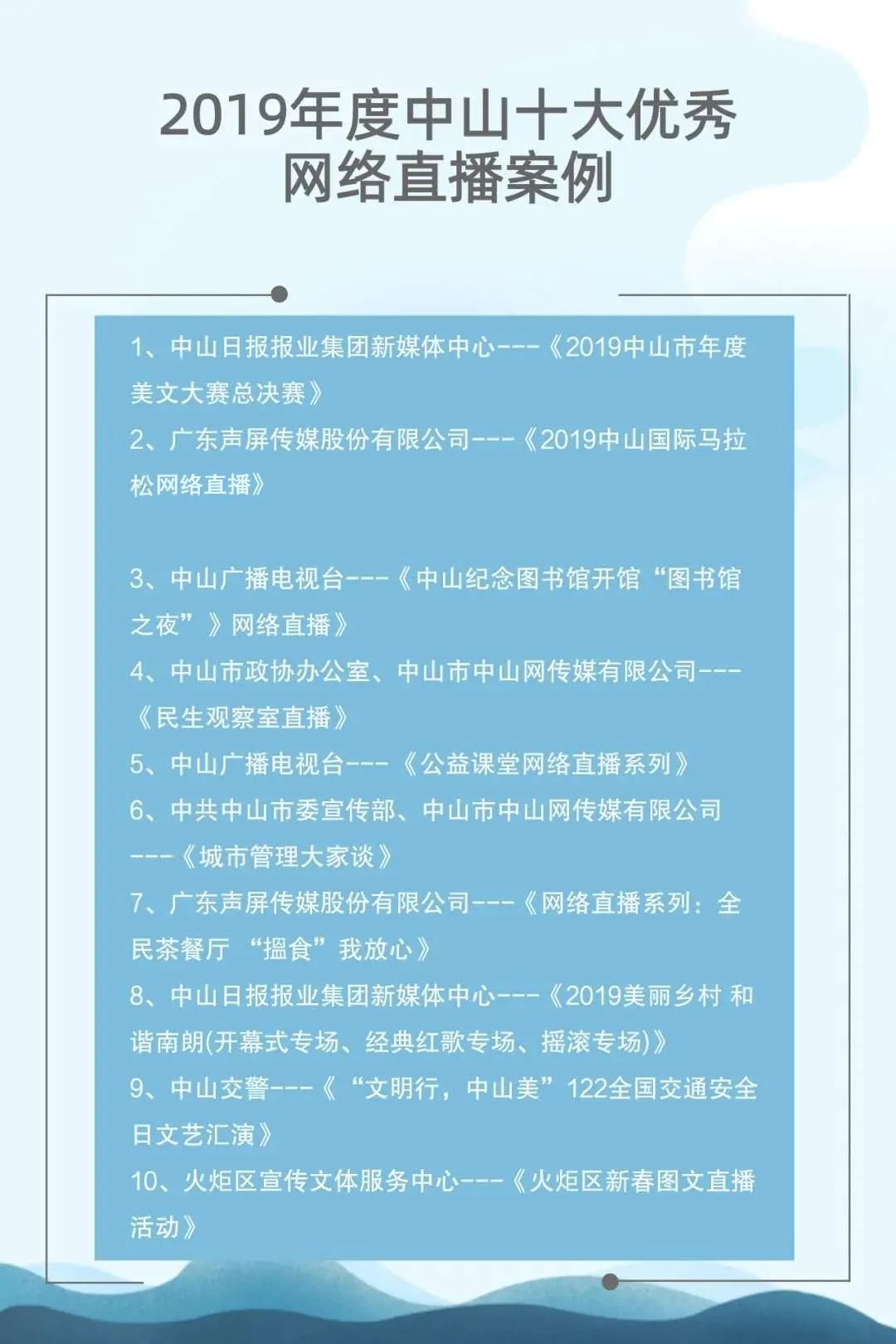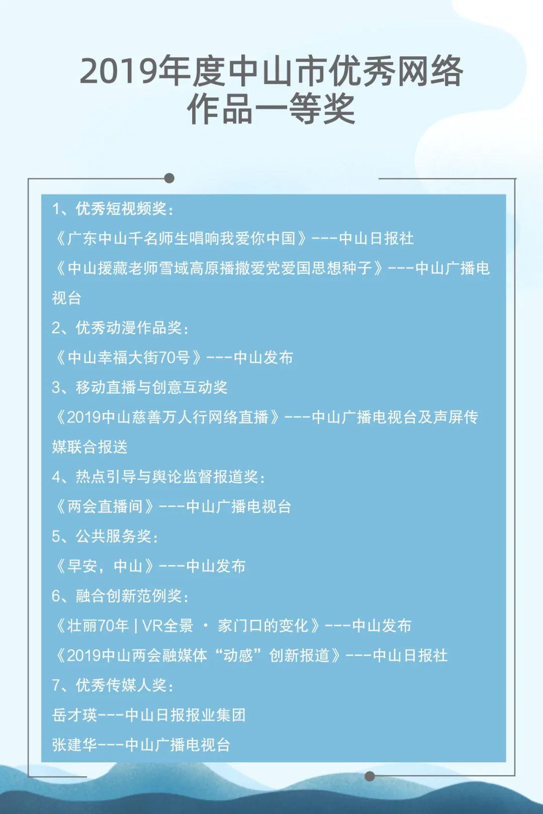 自2015年起,中山市網(wǎng)絡(luò)文化協(xié)會聯(lián)合中山日報報業(yè)集團、人民網(wǎng)輿情數(shù)據(jù)中心已連續(xù)成功舉辦了四屆中山新媒體影響力年度排行榜發(fā)布會。與此同時,自2017年起,中山廣播電視臺聯(lián)合新榜(上??窗裥畔⒖萍加邢薰荆┮惨呀?jīng)連續(xù)成功舉辦了三屆中山市新媒體頒獎盛典。兩個評選活動通過立標桿、樹典型,有效促進了中山新媒體的建設(shè)運營水平,推動了中山新媒體的健康向上發(fā)展。